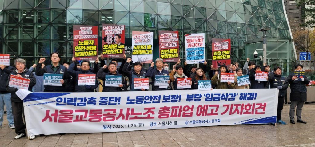서울교통공사노동조합이 서울시의 대규모 인력감축 중단과 안전 인력 충원 요구가 받아들여지지 않을 경우 오는 12월 12일 총파업에 돌입한다고 25일 선언했다. 노조는 지난 14일부터 19일까지 진행된 쟁의행위 찬반투표에서 83.53%의 찬성률로 파업을 가결했으며 , 서울지방노동위원회의 조정 중지 결정에 따라 합법적인 쟁의권을 확보한 상태다. 노조 측은 서울시가 경영효율화를 명분으로 2,200여 명에 달하는 구조조정을 강행하고 있어 노동자와 시민의 안전이 위협받고 있다고 주장하며, 사측의 태도 변화가 없을 시 12월 1일부터 준법 투쟁을 시작으로 투쟁 수위를 높일 방침이다.