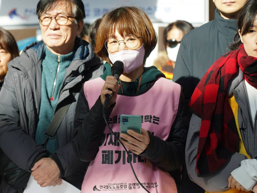 ▲1월 7일 서울역 노숙농성장 앞, 노동시민사회 92단체가 공동주최한 <단식 22일! 코레일 비정규직의 절규! “20년 일해도 최저임금! 이재명 대통령이 해결해야 합니다” 코레일네트웍스 문제해결 촉구 노동시민사회 기자회견>에서 경과보고 중인 조지현 철도노조 철도고객센터지부장