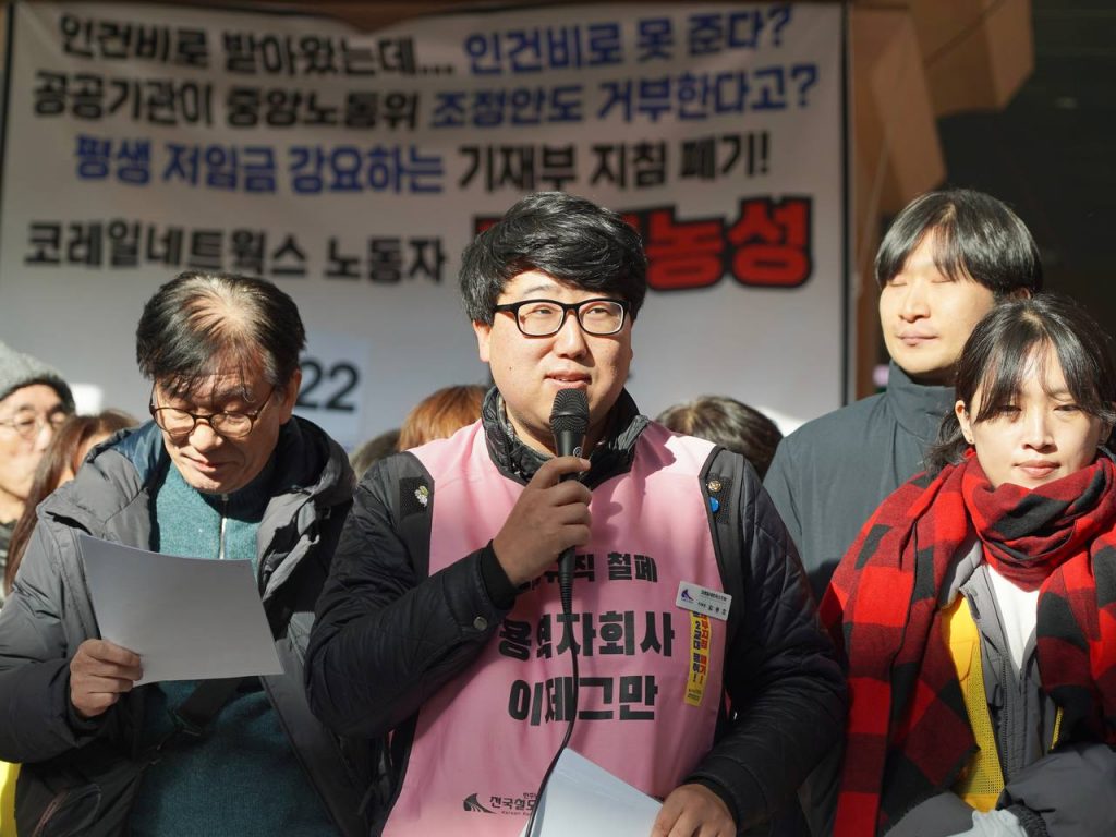 ▲1월 7일 서울역 노숙농성장 앞, 노동시민사회 92단체가 공동주최한 <단식 22일! 코레일 비정규직의 절규! “20년 일해도 최저임금! 이재명 대통령이 해결해야 합니다” 코레일네트웍스 문제해결 촉구 노동시민사회 기자회견>에서 투쟁발언 중인 김종호 철도노조 코레일네트웍스지부 쟁의대책위원장