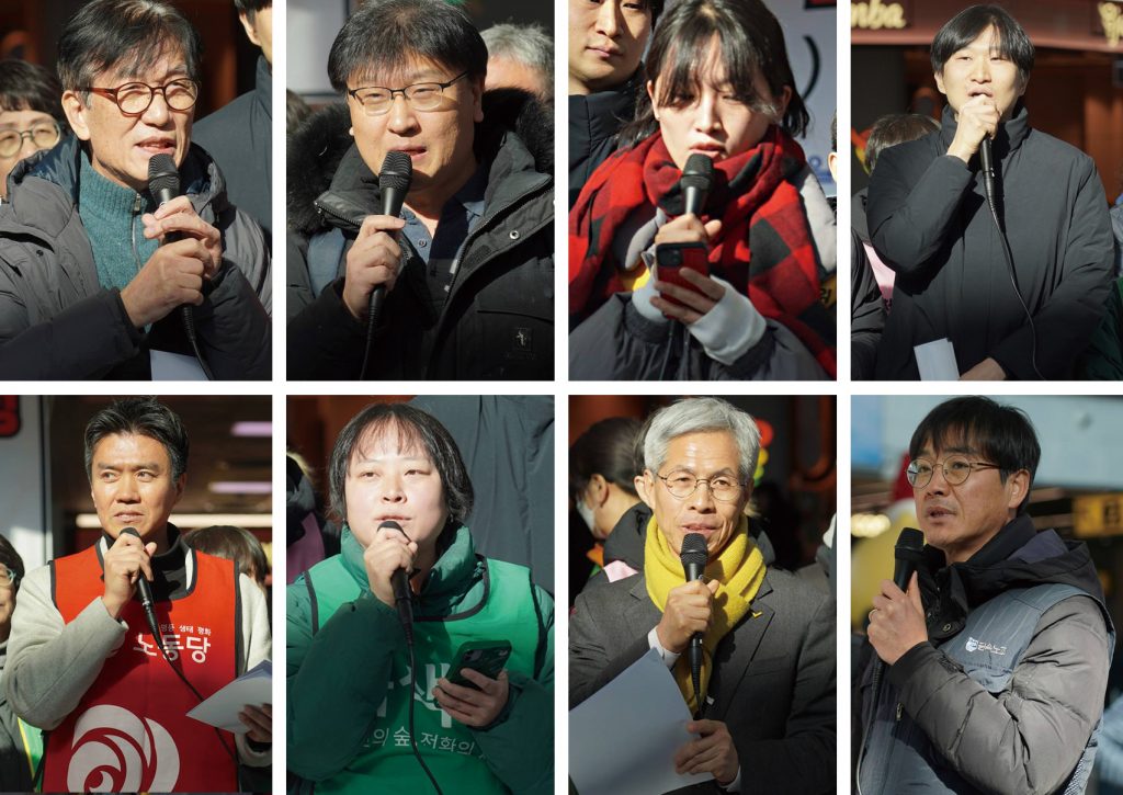▲1월 7일 서울역 노숙농성장 앞, 노동시민사회 92단체가 공동주최한 <단식 22일! 코레일 비정규직의 절규! “20년 일해도 최저임금! 이재명 대통령이 해결해야 합니다” 코레일네트웍스 문제해결 촉구 노동시민사회 기자회견> 발언자들