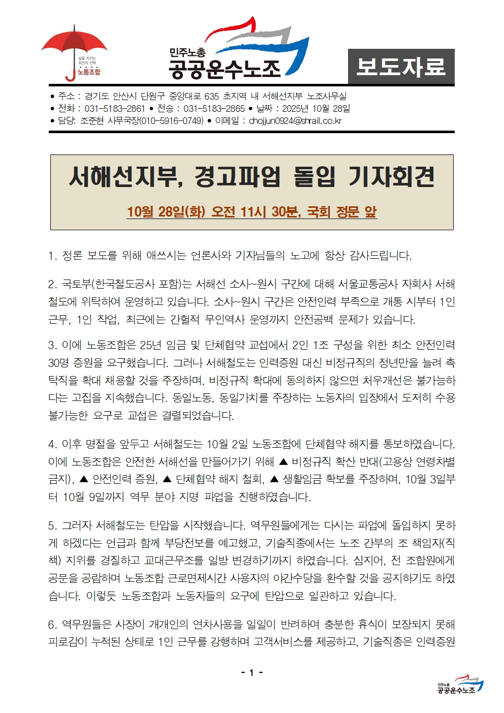 보도자료251028_서해선지부_경고파업_돌입_기자회견-.hwp