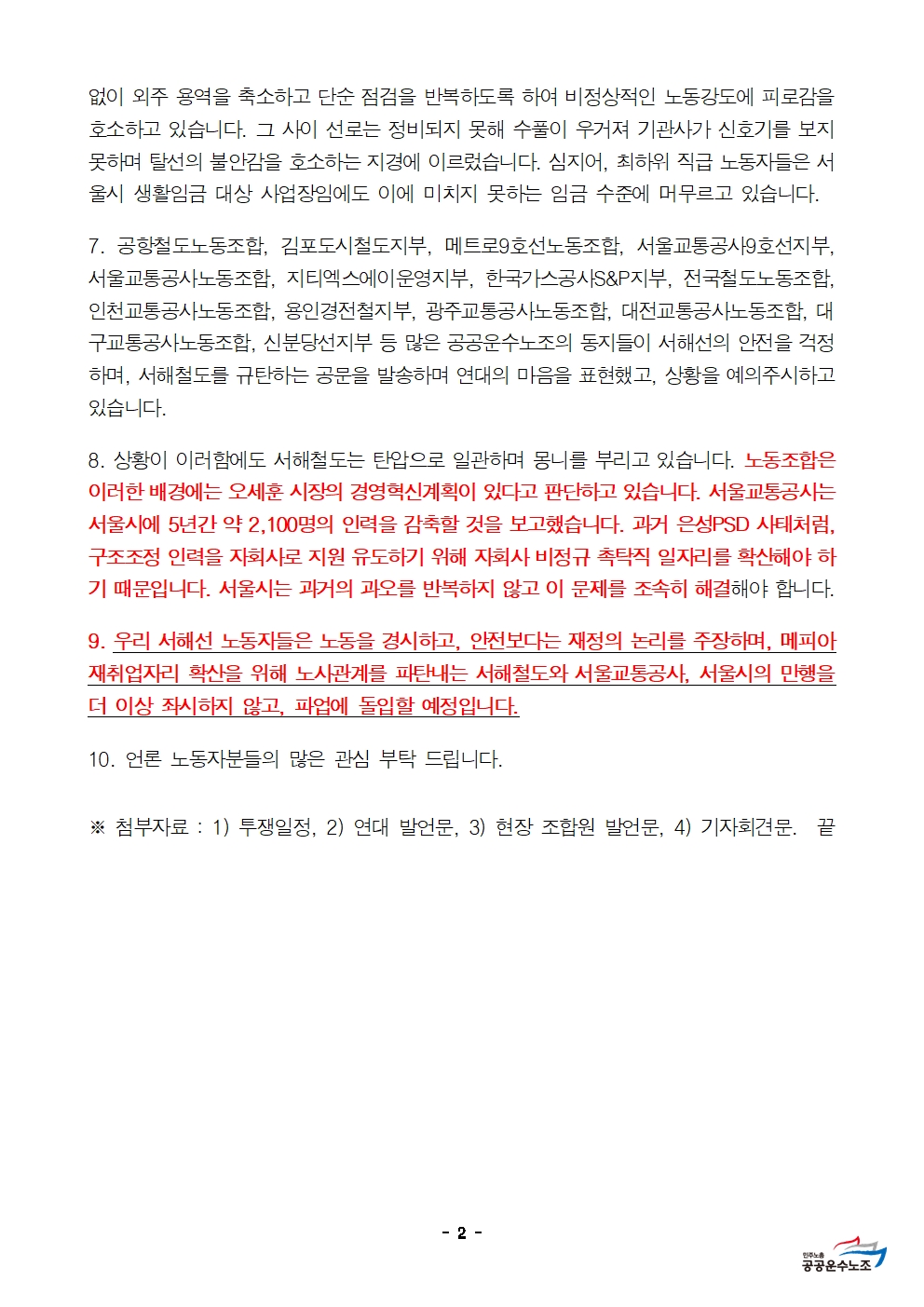 [보도자료] 민간도시철도 공공성·안전 강화를 위한 도시철도법 개정 촉구 기자회견